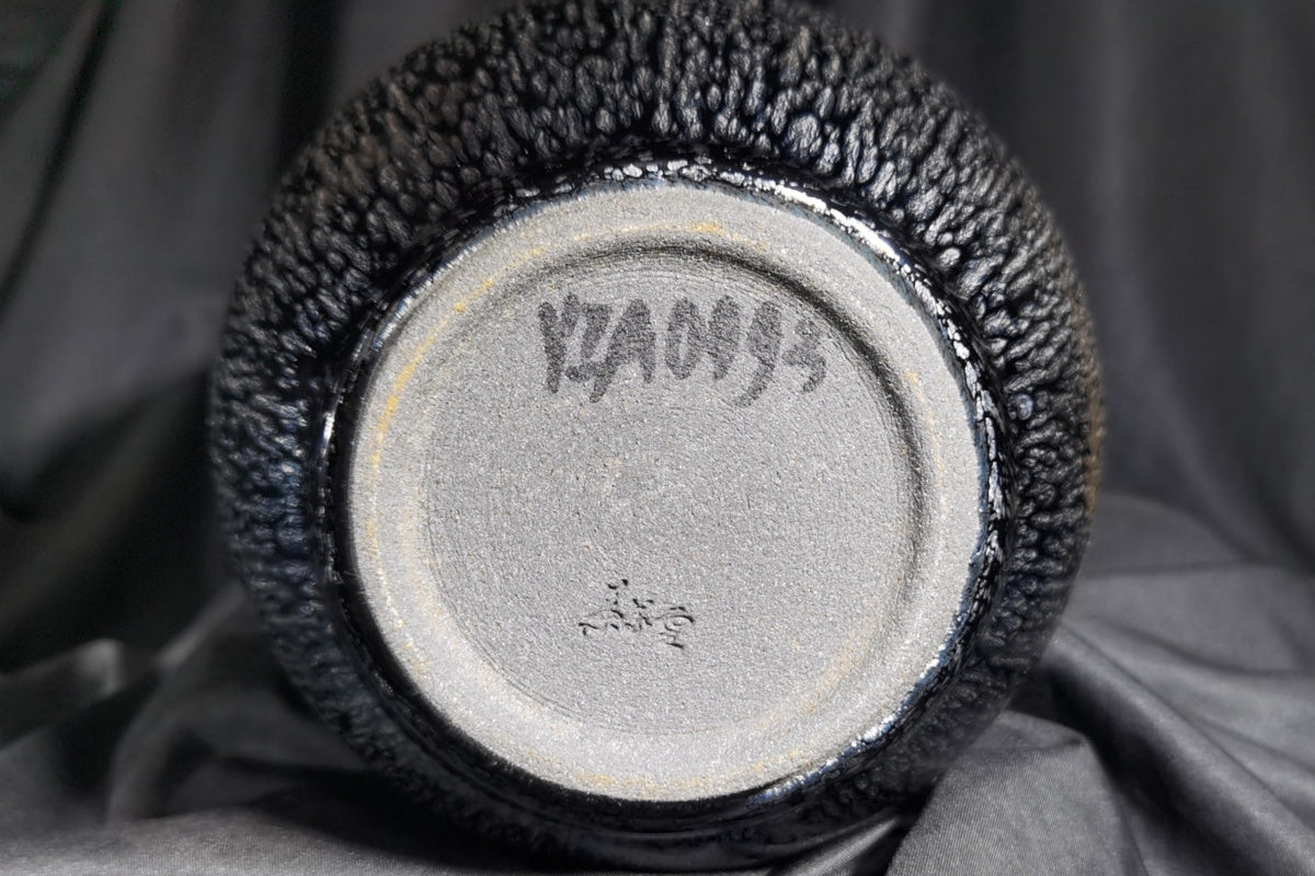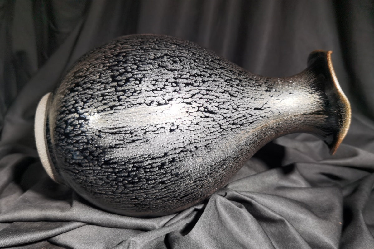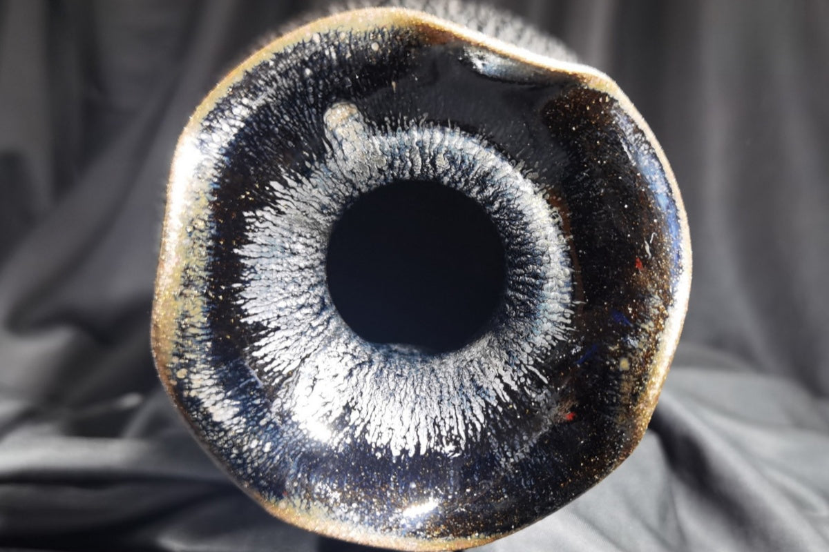 The intense, dark blue patterns on the glaze of this oil-spot plum-blossom-mouth Yuhuchun Jian Zhan vase shimmer like a star-filled night sky, evoking the precious and sacred quality of lapis lazuli.