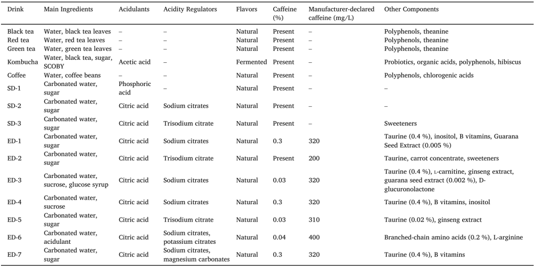 The research team tested 15 popular beverages, including five brewed drinks (coffee, black tea, green tea, rooibos tea, and kombucha), three soft drinks, and seven brands of energy drinks.