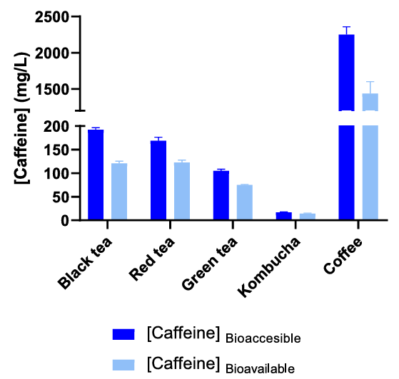 They contain the second-highest total caffeine content after coffee (242–330 mg/L), and nearly all of it is released during digestion (94%–104% bioaccessibility), with solid bioavailability (52%–76%).